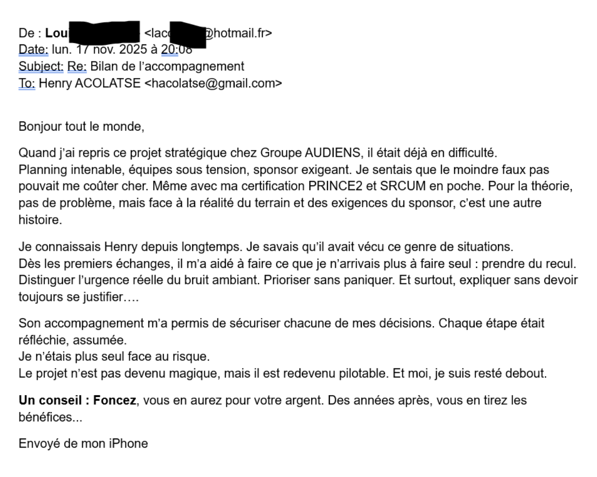 Résultat Garanti : Si, à l’issue des 3 mois, et à condition : d’avoir suivi le parcours, participé aux coachings (ou regardé les replays) et appliqué les actions convenues, …vous n’avez pas atteint le résultat attendu : réussir vos missions IT, gagner en confiance, et devenir un chef de projet pilote celui qui cadre, décide, sécurise… sans s’épuiser, nous prolongeons l’accompagnement jusqu’à ce que ce soit acquis.
